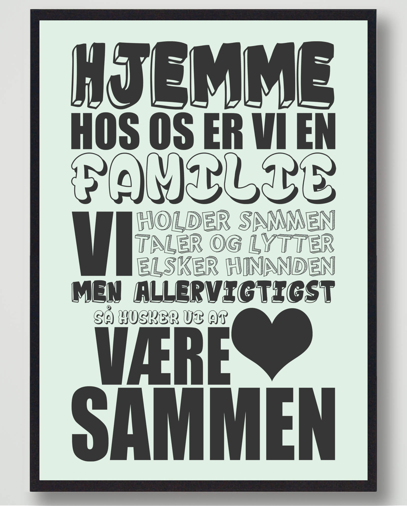 Vi har fundet Hjemme Hos Os Mint – Plakat fra Plakatdyr.dk hos Plakatdyr.dk i kategorien Husregler Plakat. Hjemme hos os er vi en familie Hvilke regler kendetegner jeres familie, og hvilke regler er gældende hjemme hos jer? Uanset hvilke regler i har derhjemme, kan vi vist alle blive enige om, at det at holde sammen og være sammen er af høj prioritet hos alle