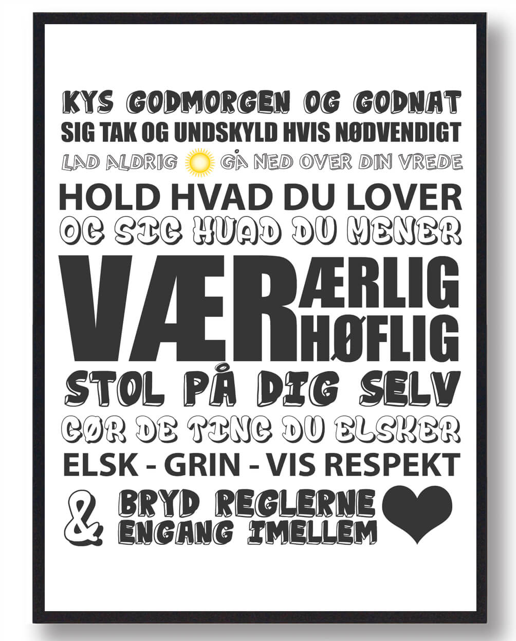 Vi har fundet Kys Hinanden Godmorgen Hvid – Plakat fra Plakatdyr.dk hos Plakatdyr.dk i kategorien Husregler Plakat. Kys godmorgen og godnat Hvilke værdier, synes du, er vigtige i et parforhold eller i en familie? Vi har samlet en lang række vigtige værdier, regler og budskaber, som er fundamentale for enhver relation. Det flotte grafiske design kombineret med ordenes